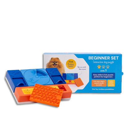 Beginner Set heeft mechanismen om snoepjes te verstoppen, zoals schuiven en deksels draaien, waardoor de hond op een comfortabel tempo zijn probleemoplossende vaardigheden kan ontwikkelen. Bovendien bevat het een likmat voor extra plezier.